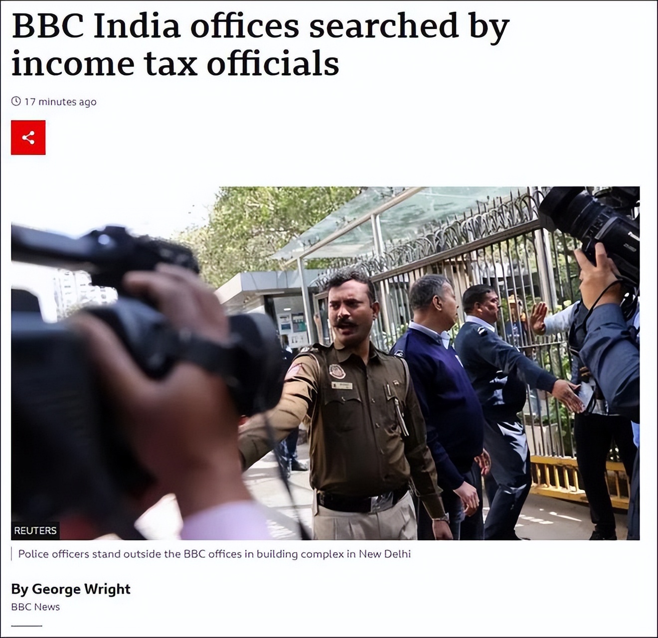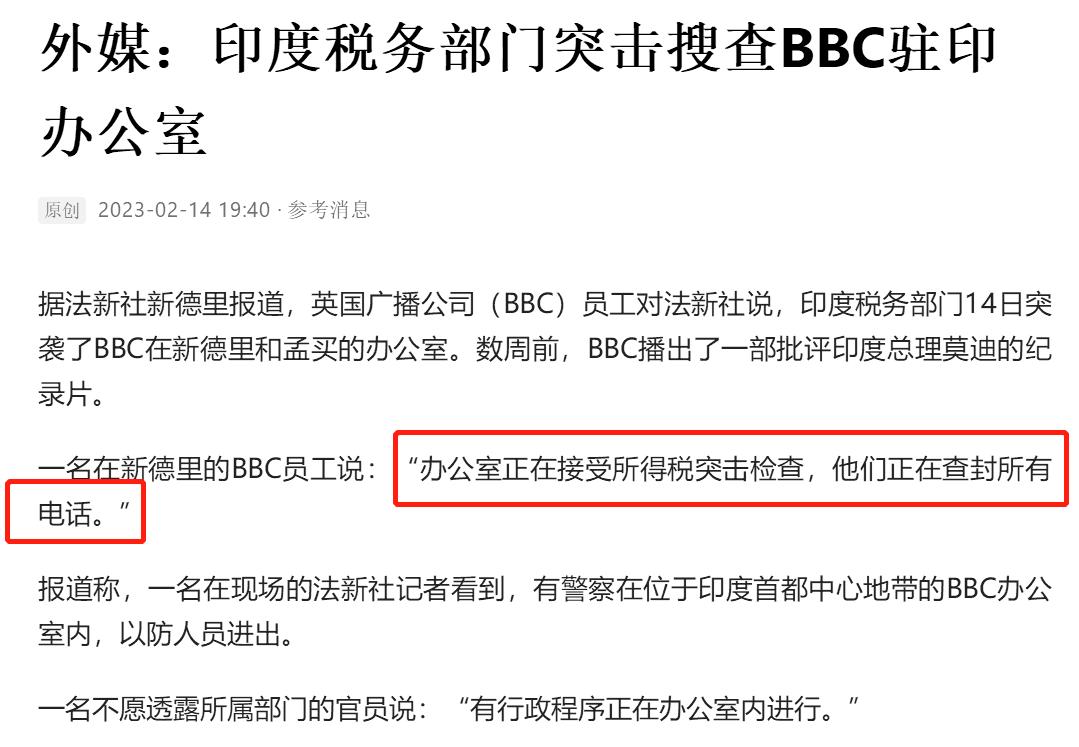 據法新社報導,當地時間二月十四日,印度稅務部門麾下的稅務警察突擊搜查了英國廣播公司(BBC)駐印度新德里和孟買的辦公室。據BBC員工稱,印度稅務警察封鎖了辦公大樓,不允許任何人進出。與此同時,稅務警察在大樓內進行大搜查,並帶走了一大批文件,並查封所有電話。