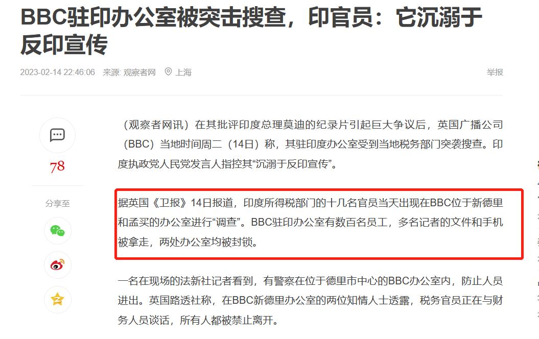 有不少美西方專家認為,若美國沒能控制好對印度的扶持力度,那麼未來飛速發展的印度對美國霸權構成的威脅很可能不亞於中國。為了避免這一局面的出現,美西方在與印度展開合作時往往非常謹慎,並且還會時不時批評、敲打印度,讓其趁早打消稱霸一方、擺脫控制的野心。此次BBC製作這一紀錄片的目的就在於此。所以在此次搜查BBC駐印辦公室的過程中,就有印度高層官員聲稱BBC是「世界上最腐敗的組織」,指責其報導「充滿惡意、淺薄、有導向性」,且「沉溺於反印宣傳」。