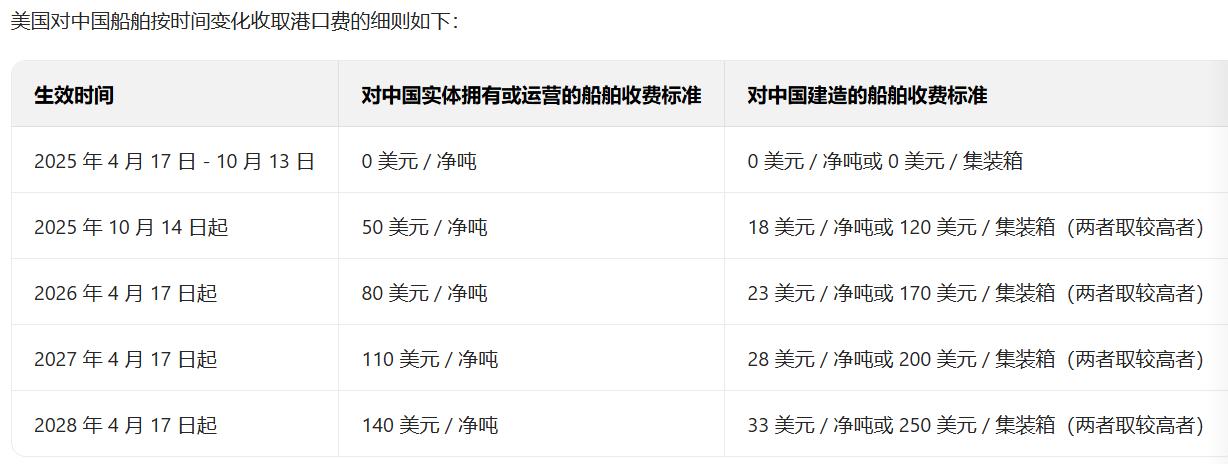 美国对中国船舶加收港口费是今年4月17日,是因为美国全球加征关税,之后中国报复之后双方报复措施螺旋上升时美国出台的政策,10月14日要正式实施,具体政策是: